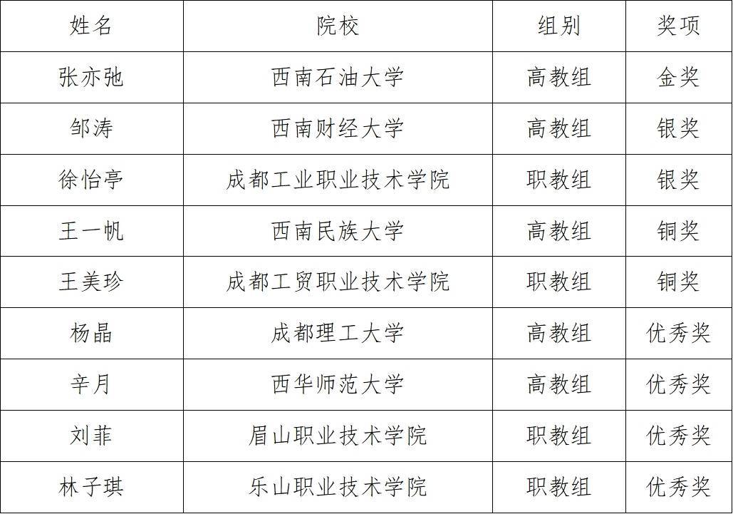 r本次比赛以“筑梦青春志在四方,规划启航职引未来”为主题,聚焦职业发展与就业指导课程建设核心,通过课程建设汇报、教学展示、互动答辩三个环节,综合考察学校课程建设情况与教师教学能力水平,竞争尤为激烈。其中,西南石油大学张亦弛凭借扎实的课程建设功底、新颖的教学设计理念,在各环节中脱颖而出,以小组第1的成绩斩获金奖。具体获奖情况如下: